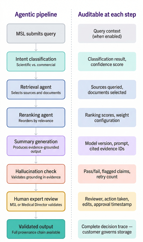 This matters practically, not just philosophically. When a Medical Science Liaison questions why the platform surfaced a particular insight, or when a quality team needs to audit how a document was generated, the ability to reconstruct the full decision chain — from query to retrieval to ranking to generation to human review — is what separates a trustworthy system from a black box that happens to produce plausible output.